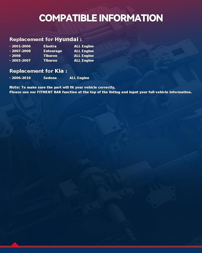 - Compatible Devices : Hyundai Models: 2001-2006 Elantra 2.0L l4, 2007-2010 Entourage 3.8L V6, 2003-2008 Tiburon 2.0L l4/ 2.7L V6; Kia Models: 2006-2010 Sedona 3.8L V6 Hyundai Models: 2001-2006 Elantra 2.0L l4, 2007-2010 Entourage 3.8L V6, 2003-2008 Tiburon 2.0L l4/ 2.7L V6; Kia Models: 2006-2010 Sedona 3.8L V6