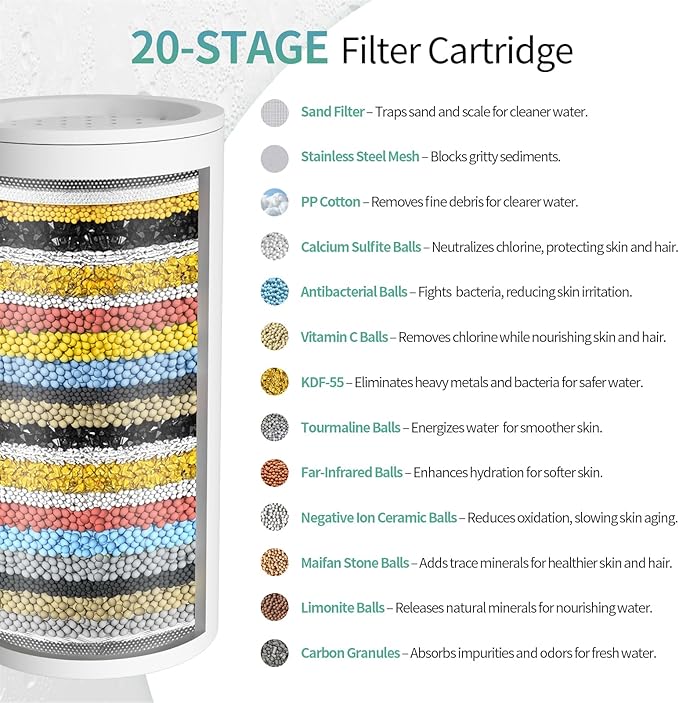 - 【20-Stage Shower Filter Head for Hard Water 】Hard water causing dry skin and dull hair? Our SR SUN RISE Shower Head features a 20-stage filtration system with KDF-55, Vitamin C, Calcium Sulfite, and 7 other premium filter media to effectively remove chlorine, heavy metals, fluoride, and impurities.Perfect for hard water areas, it delivers clean, safe water that’s gentle on your skin, hair, and nails—ideal for families and kids who deserve the best.