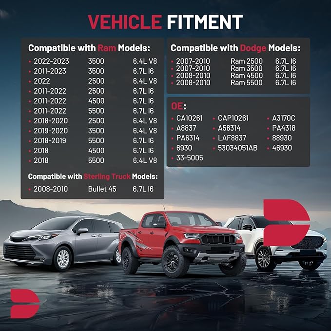 - 【COMPATIBILITY】Compatible with Ram Models: 2018-2020 & 2022 2500 6.4L V8, 2011-2022 2500/4500/5500 6.7L l6, 2019-2020 & 2022-2023 3500 6.4L V8, 2011-2023 3500 6.7L l6, 2018 5500 6.4L V8; Compatible with Dodge Models: 2007-2010 Ram 2500/Ram 3500 6.7L l6, 2008-2010 Ram 4500/Ram 5500 6.7L l6; Compatible with Sterling Truck Models: 2008-2010 Bullet 45 6.7L l6