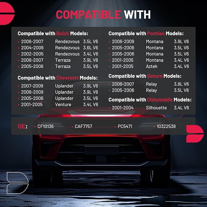 - [Vehicle Fitment] Compatible with Buick Models: 2006-2007 Rendezvous 3.5L V6, 2004-2006 Rendezvous 3.6L V6, 2002-2005 Rendezvous 3.4L V6, 2006-2007 Terraza 3.9L V6, 2005-2006 Terraza 3.5L V6; Compatible with Chevy Models: 2006-2009 Uplander 3.9L V6, 2005-2006 Uplander 3.5L V6, 2001-2005 Venture 3.4L V6; Compatible with Oldsmobile Models: 2001-2004 Silhouette 3.4L V6; Compatible with Pontiac Models: 2005-2006 Montana 3.5L V6, 2006-2009 Montana 3.9L V6, 2001-2005 Montana/Aztek 3.4L V6