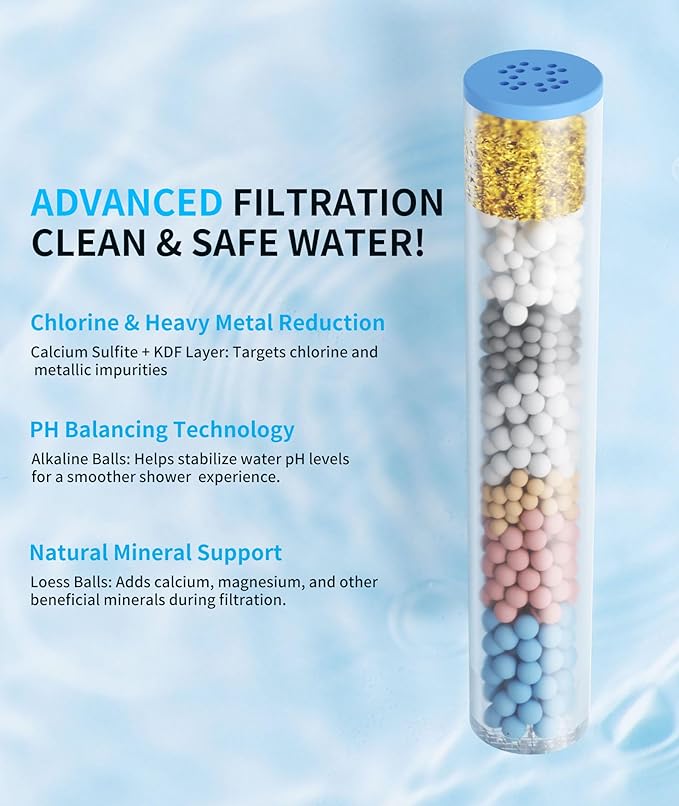 - Multilayer Filtration for Healthier Skin & Hair: Advanced filtration technology combines Calcium Sulfite Balls , Alkaline Mineral Balls, Loess Clay Balls, KDF-55,Together, they eliminate harsh chemicals, purify hard water, protect hair color from fading, and maintain skin’s natural moisture—ideal for sensitive skin and color-treated hair.