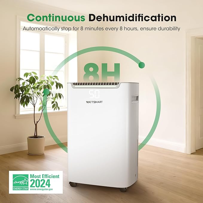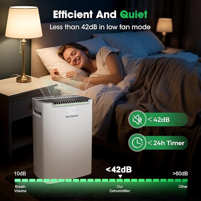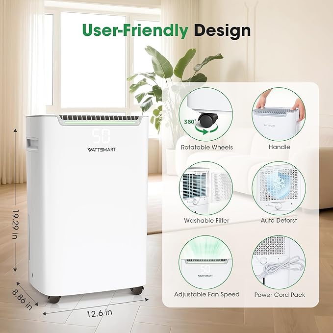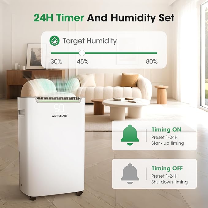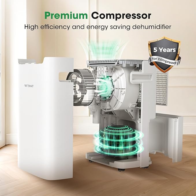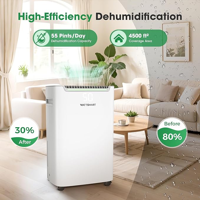 - Dehumidification Capacity : 55 pints/day dehumidification (under 95°F, 95% RH conditions), suitable for spaces up to 4,500 sq. ft. Equipped with a high-efficiency compressor, featuring low vibration, stable operation, and powerful dehumidification. It is ideal for basements, bathrooms, bedrooms, and RVs