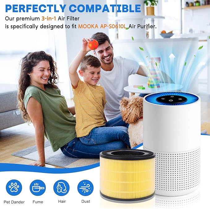AP-S0610L Air Filter Replacement Compatible with Mooka, 3-in-1 H13 Ap-s0610l Replacement Filter, Pre-Filter Activated Carbon Fit for Mooka Air Puri-fier, 2 PC, Yellow