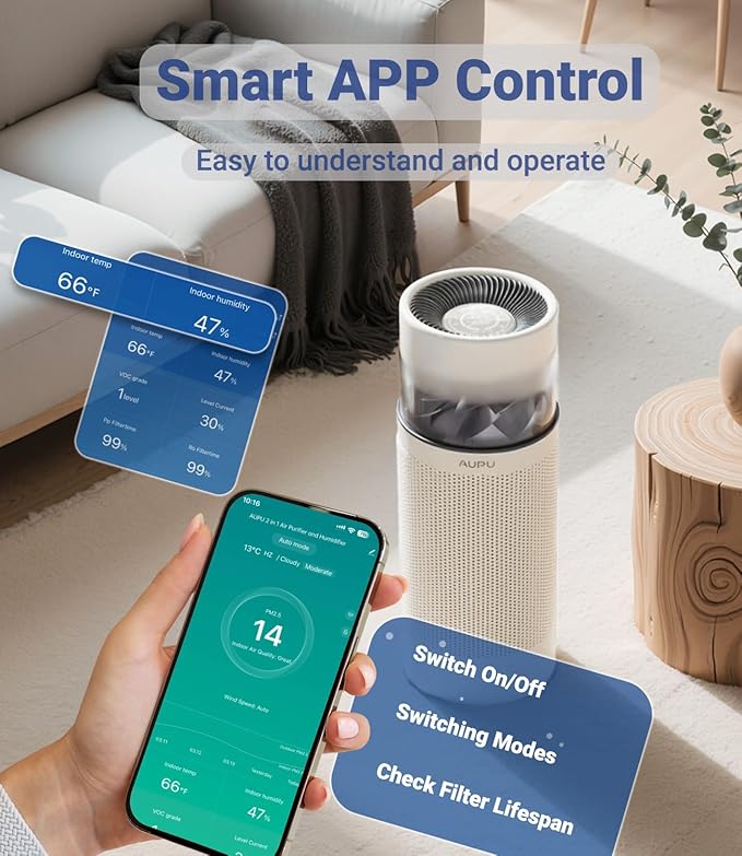 - High Capacity & Top Fill Design: Water tank capacity is 5.5L, the humidification max output has reached 1100ml/h. Refill the water tank of humidifier and air purifier combo from the top directly. The top - fill water design enables you to add water with greater ease.