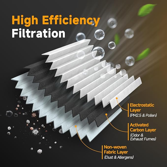 - [Triple-Layer Protection] Pruto Triple-Layer Activated Carbon Filter and HEPA media captures 99% dust and particles, offering finer filtration than basic filters. The electrostatic layer and coconut charcoal block exhaust fumes and wildfire smoke odors, ensure fresh air