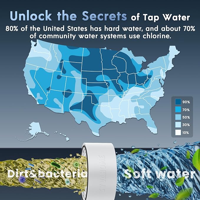 - Unlock the Secrets of Tap Water: Studies reveal that 80% of areas in the U.S. have hard water, and approximately 70% of community water systems use chlorine. Tap water often contains residual chlorine, rust, and heavy metals such as lead, mercury, nickel, and chromium. Research indicates that our bodies absorb water not only through drinking but significantly through the skin, Prolonged exposure to chlorinated water can lead to dry, itchy skin and brittle hair. Take action today to protect the health of you and your family