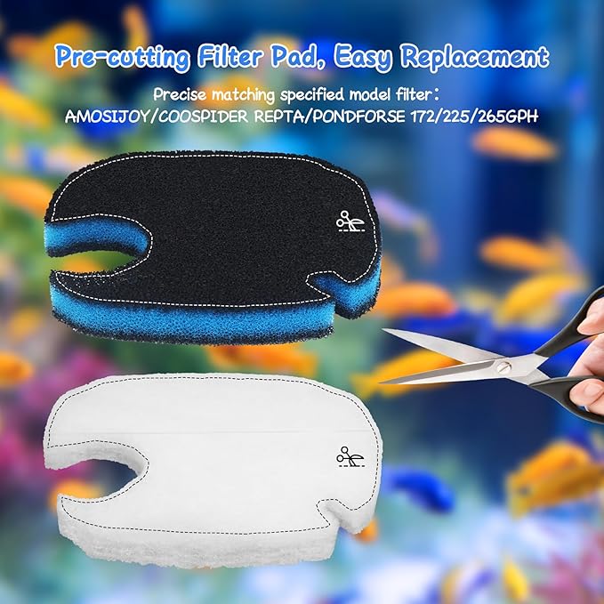 - Perfect Match for Your Filter System: No more ill-fitting media! These filter pads for aquarium are pre-cut for seamless replacement for AMOSIJOY/COOSPIDER REPTA/PONDFORSE 172/225/265GPH