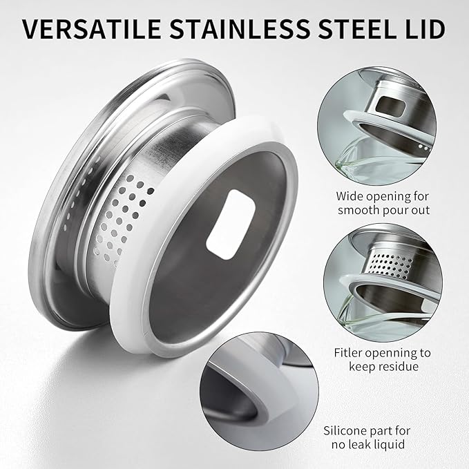 - High Borosilicate Glass: The water pitcher is made of heat resistant Borosilicate glass and can Two Different Pour Functions: The iced tea pitcher comes with premium 304 stainless steel lid that has 2 different pour functions, one with tiny holes to act like a strainer to keep ice or fruits inside pitcher when pouring and 180 degree turn of the cap provides a “wider” mouth. The lid also has a silicone ring that improves sealing performance and reduces leaks or spills.