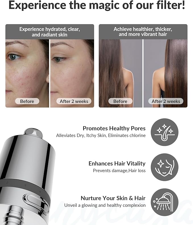 - Healthier Skin & Softer Hair, Naturally Ideal for sensitive skin, dry scalp, or color-treated hair. By filtering out harsh chemicals and heavy metals, this shower filter helps reduce redness, flakiness, and frizz—leaving your skin hydrated and your hair soft, smooth, and more manageable.