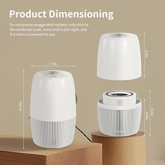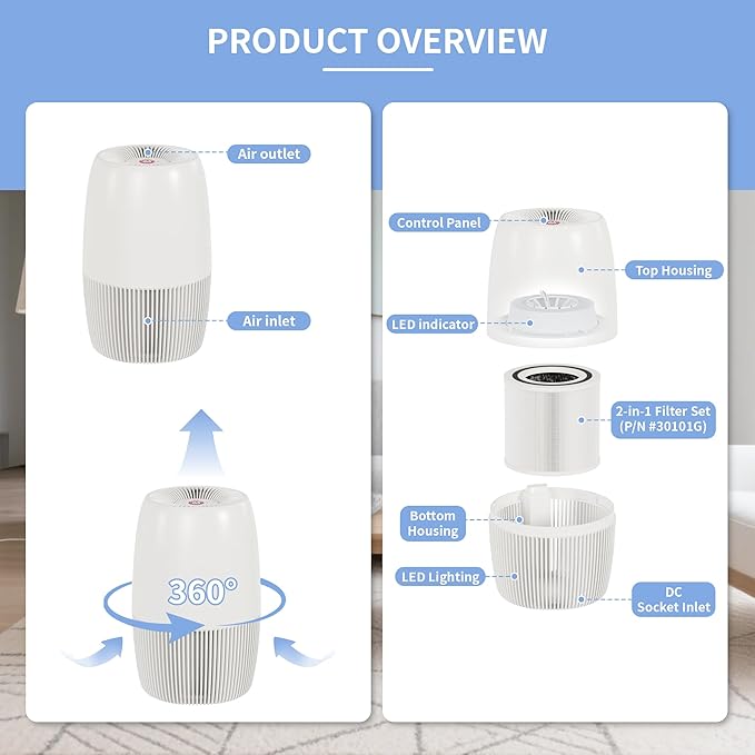 - ADJUSTABLE SOFT AMBIENT LIGHTING & QUIET OPERATION: Offers 4 gentle LED brightness settings for day or night ambiance; set your air purifier to Sleep Mode for near-silent low-speed operation, ensuring undisturbed rest and enhanced relaxation for smooth, sweet sleep.
