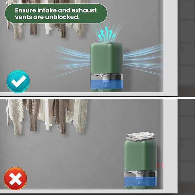 - High Efficient Dehumidifiers for Home: The small dehumidifier can save on energy bills without sacrificing performance. This energy efficient dehumidifier uses only 40W of power to remove up to 280ml of water daily. Keep your small room comfortably while being kind to your wallet and the planet. Energy-efficient & powerful dehumidifier for bedroom. Tips: Please keep the top air inlet and the back outlet of this dehumidifier free from blocking.