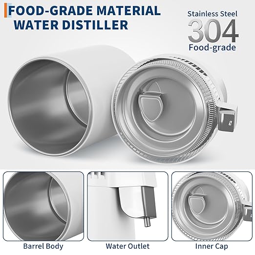 - Advanced Cooling System with Fast Heat Dissipation: Equipped with a lightweight aluminum four-blade fan and 304 stainless steel condensing coil, this countertop water distiller efficiently dissipates heat, enhancing performance and durability for long-term use