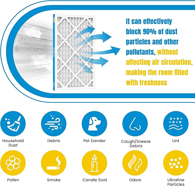 - 【MERV 8 Rated Filtration】Provides effective basic protection by capturing common airborne pollutants.Efficiently traps dust, pollen, pet dander,and other large particles (3-10 microns) to improve indoor air quality and safeguard your family's respiratory health