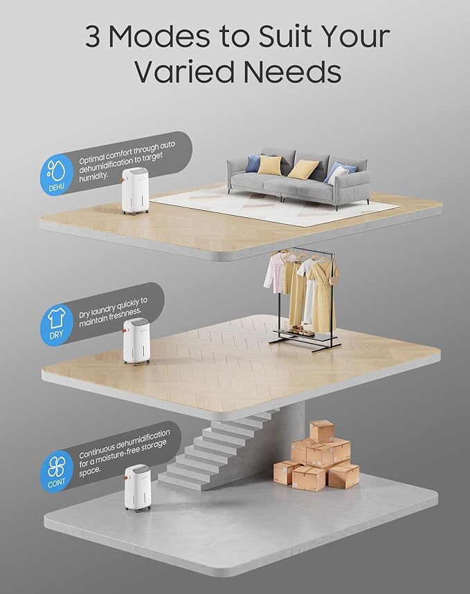 - 【 Versatile Dehumidifier for Home】 This dehumidifier for basement is equipped with 3 modes for various needs: dehumidify mode (optimal comfort with auto dehumidification), dry clothes' mode (keep your clothes dry in rainy days), continuous dehumidify mode (keep constantly damp spaces under control).